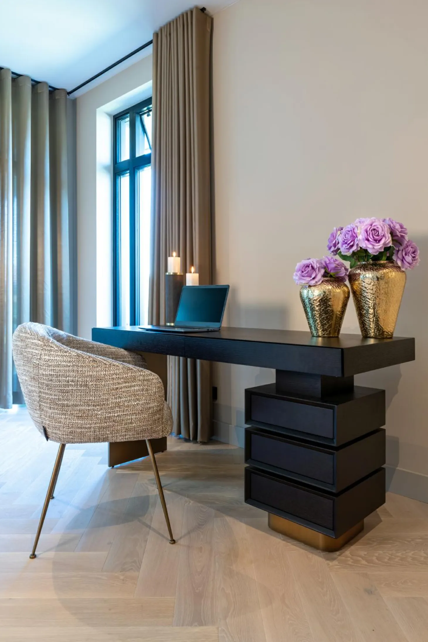 | Materiaal | Eikenfineer afgewerkt in charcoal kleur en gegalvaniseerd RVS onderstel, geborstelde afwerking, grepen en details met matte |