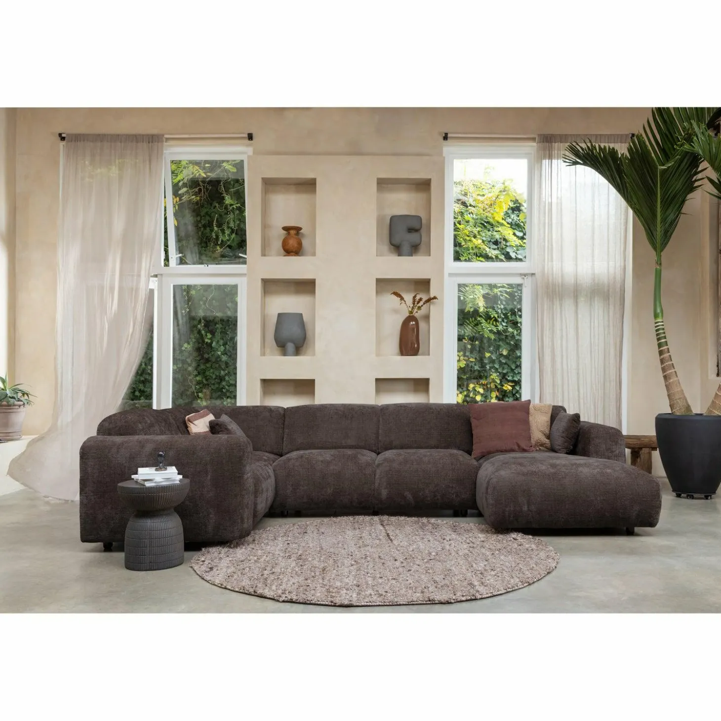 Stap binnen in de wereld van comfort en stijl met de Cloud hoekbank links geweven chenille in warm bruin van WOOOD. Deze bank is niet zomaar een meubelstuk; het is een uitnodiging om te ontspannen en te genieten. Met zijn afgeronde vormen en luxe chenille stof, gemaakt van 100% polyester, biedt de Cloud bank een warme en uitnodigende sfeer die perfect past in elke woonkamer.