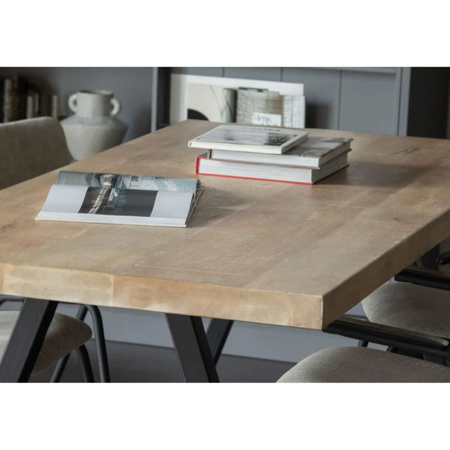 | Bijzonderheden | Mangohouten blad met lime wash finish en metalen poten |