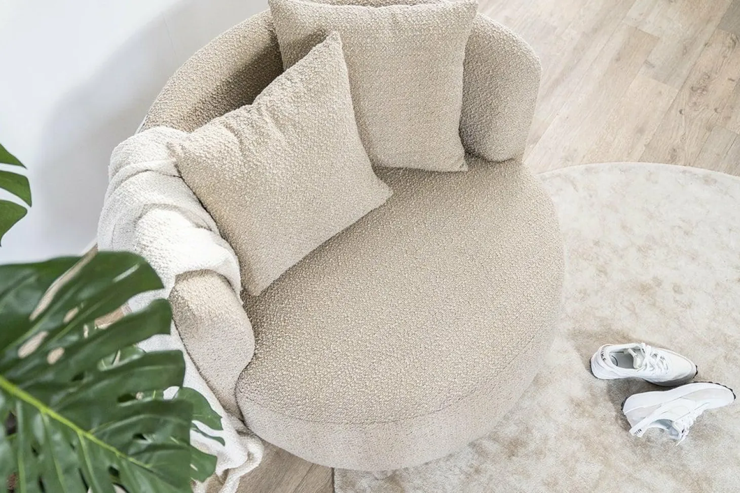 De fauteuil Louis van Eleonora is een heerlijke relax fauteuil om na een lange dag werken neer te ploffen. De zachte bouclé stof Spark voelt heerlijk zacht aan en dankzij de 2 bijgeleverde kussens kun je er verschillende kanten mee op.