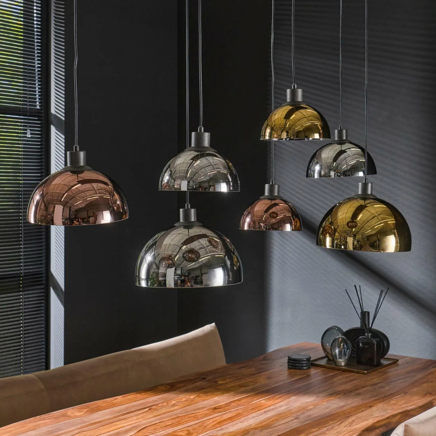 Deze moderne hanglamp met 7 verschillende kappen in koper, chroom en goud is een absolute blikvanger! De lamp is gemaakt van hoogwaardig materiaal en heeft een eigentijds design. De kappen hebben per kleur een eigen vorm, waardoor ze een speelse uitstraling hebben. Elke kap kan individueel worden versteld tot een hoogte van 150 cm, waardoor je zelf kunt bepalen hoe je ze wilt ophangen. Er wordt aanbevolen twee kleer LED lichtbron (8466) te gebruiken en 5 keer LED lichtbron (8463).