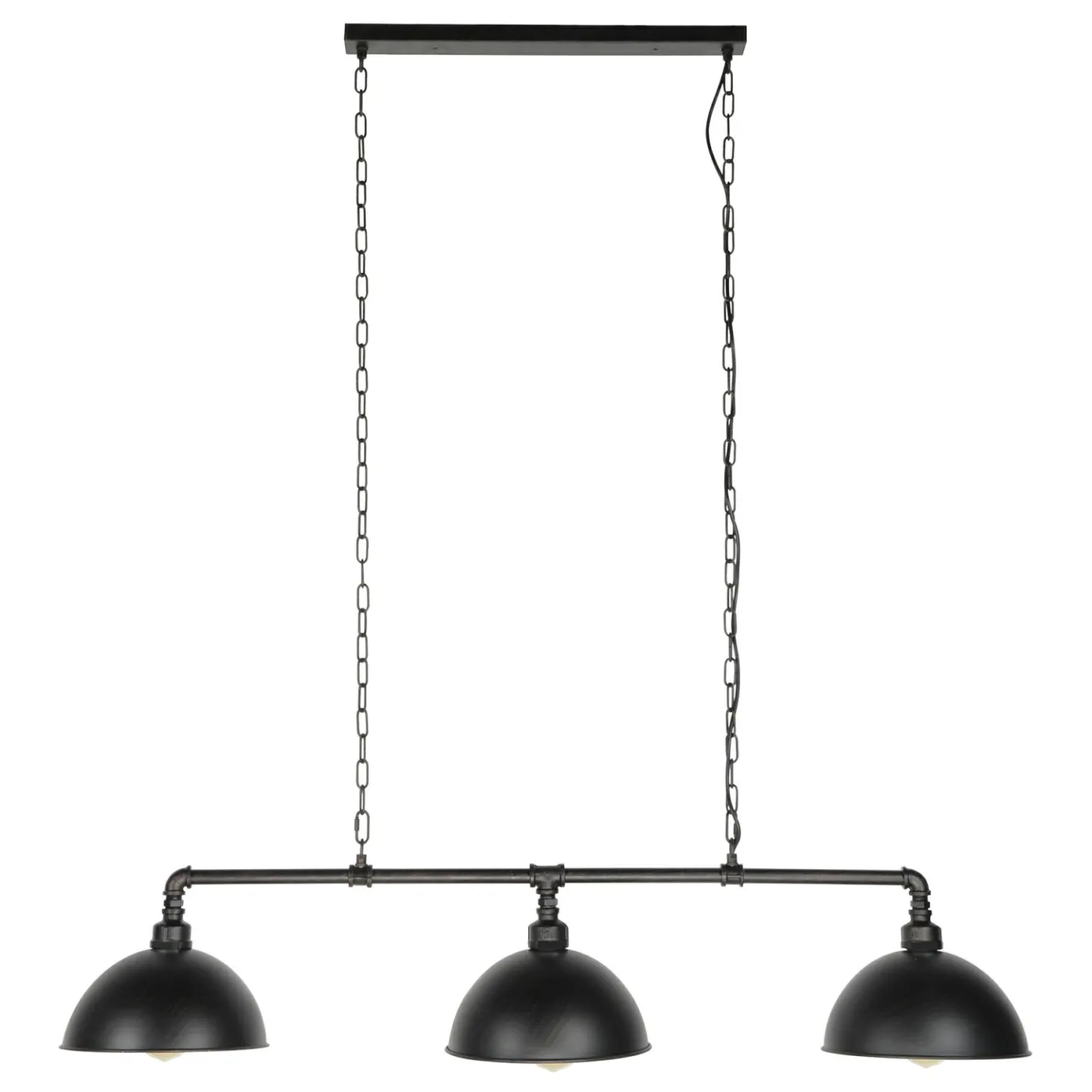 Het frame van deze 3-lichts hanglamp is vervaardigd van waterleidingbuizen. De halfronde metalen kappen zijn hieraan bevestigd. Middels kettingen hangt de complete lamp aan één plafondbevestiging.Er wordt aanbevolen LED lichtbron (8463) of (8450) te gebruiken.