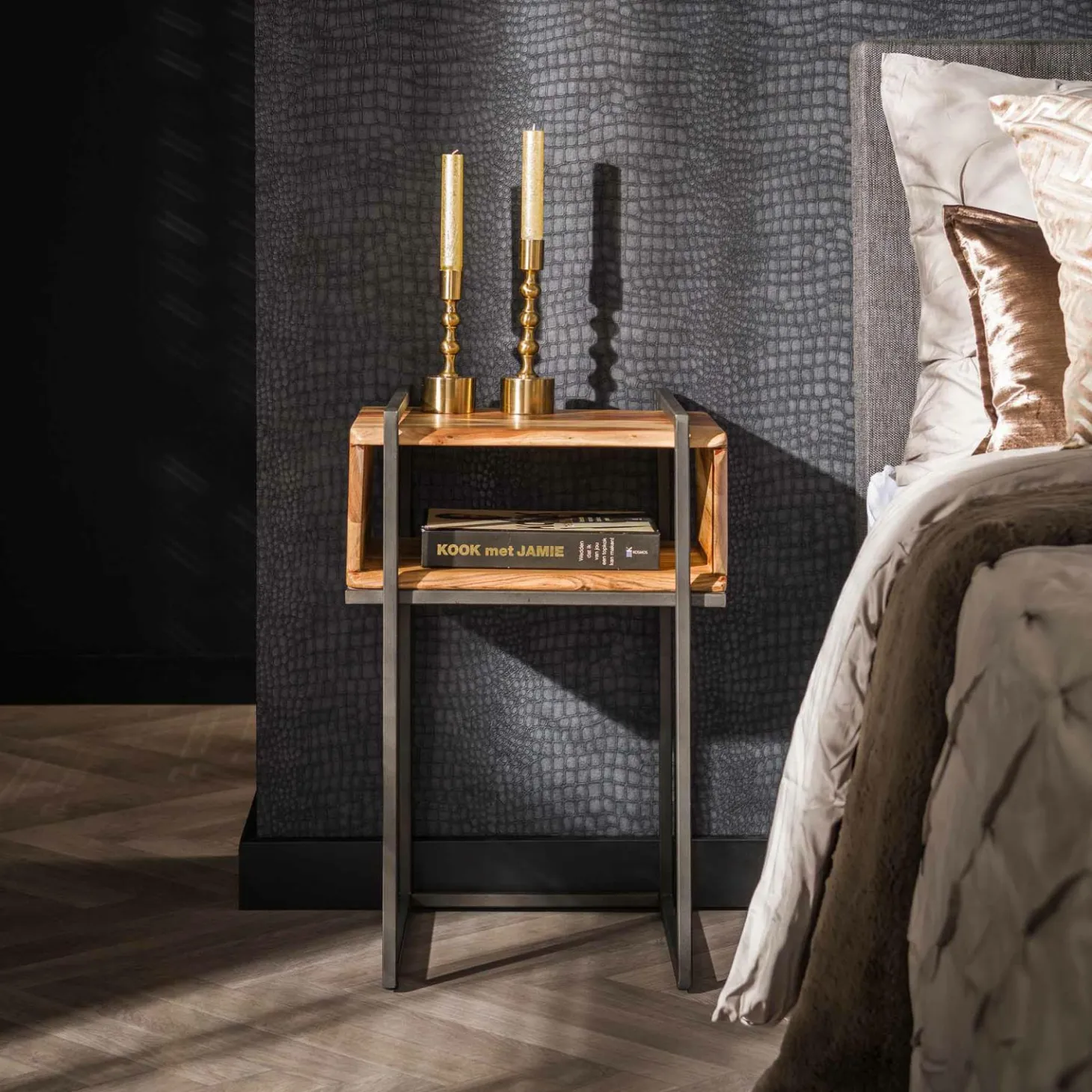 Dit nachtkastje ‘edge’ is uitgevoerd in acaciahout met een metalen frame. Het nachtkasje heeft één open vak met aan alle zijden een live edge afwerking. Het nachtkastje heeft een bijpassende kaptafel en TV-meubel.