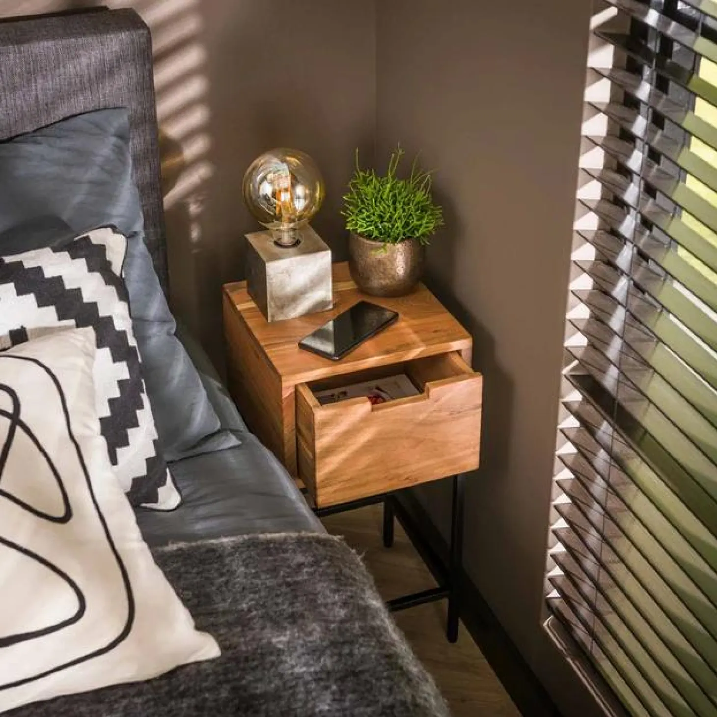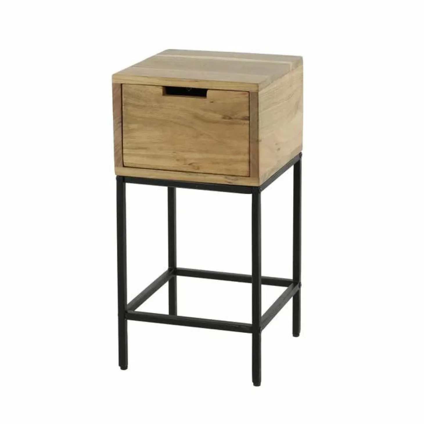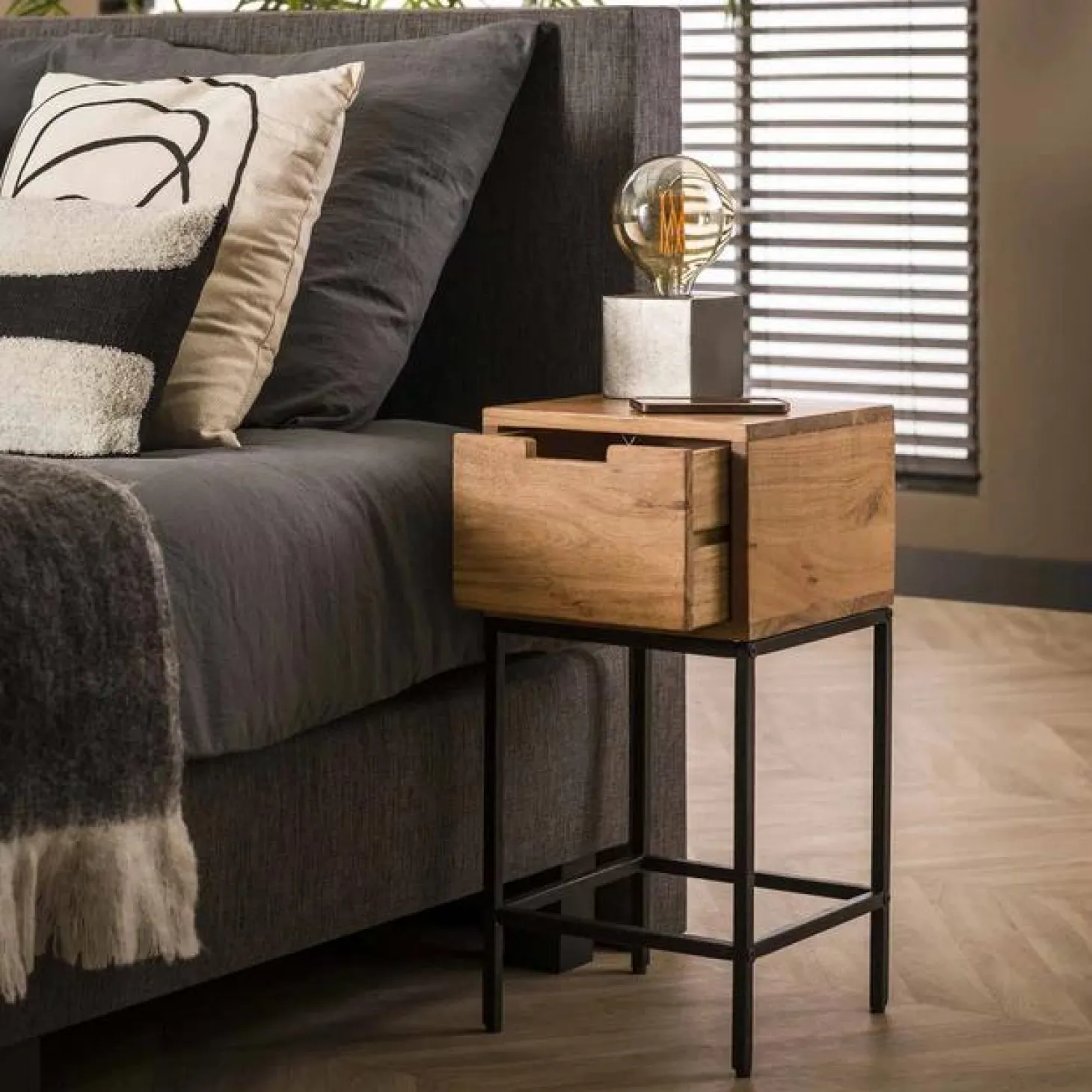 Dit nachtkastje ‘flat’ is uitgevoerd in acacia hout. Het nachtkastje heeft een lade en een metalen onderstel. Het nachtkastje heeft een afmeting van 30x30cm en is dus heel compact. Ideaal voor een kleinere slaapkamer!