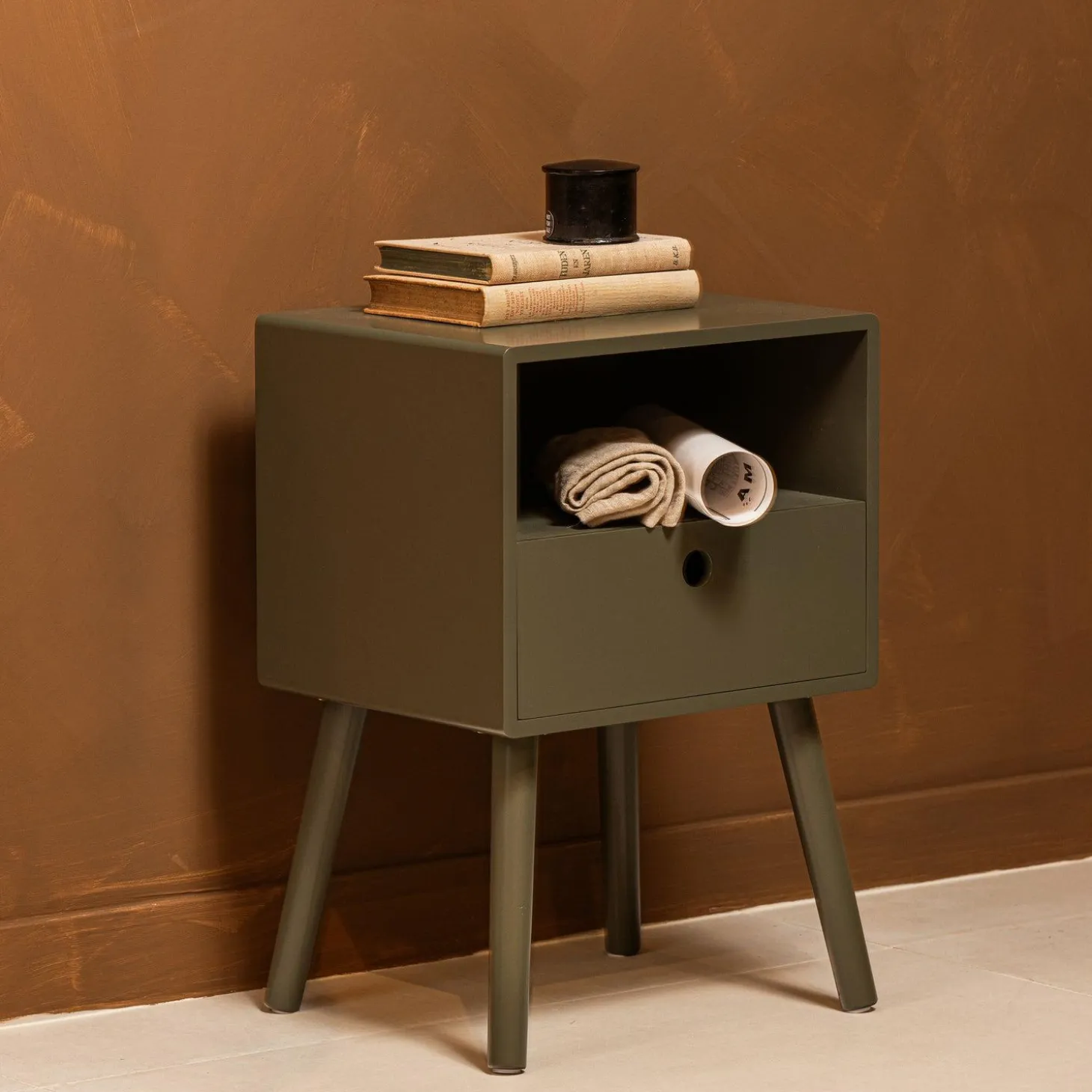 Of je nu een moderne, Scandinavische of klassieke stijl hebt, Ozzy past zich moeiteloos aan. Plaats het naast je bed voor een serene sfeer of gebruik het als bijzettafel in de woonkamer voor een speelse twist. De warme groene kleur zorgt voor een subtiele, maar opvallende touch.