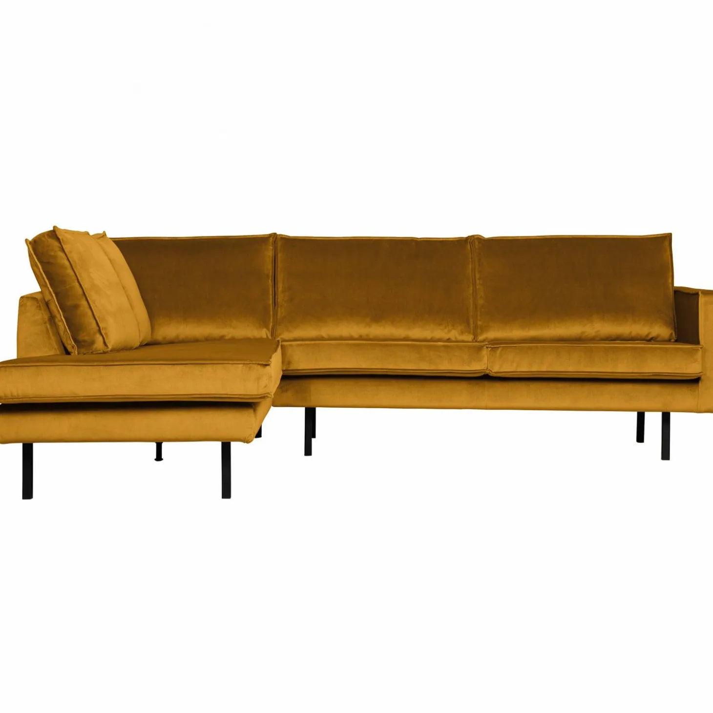 Maak kennis met de Rodeo hoekbank links velvet oker, jouw nieuwe favoriete plek om te ontspannen. Deze bank is niet zomaar een meubelstuk; het is een statement. Met zijn eigentijdse en chique design uit de bekende Rodeo serie, brengt hij een vleugje luxe in je woonkamer. De rijke okerkleurige velvet bekleding, gemaakt van 100% polyester, straalt warmte en elegantie uit.