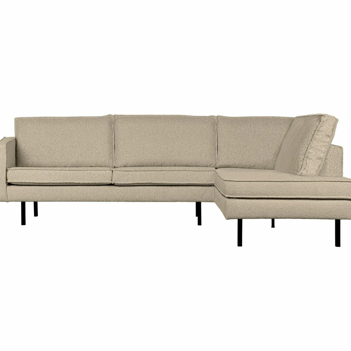 Stap binnen in de wereld van comfort en stijl met de Rodeo hoekbank rechts bouclé beige. Deze bank is niet zomaar een meubelstuk; het is een uitnodiging om te ontspannen en te genieten van je eigen thuis. Met zijn eigentijdse en chique design, geïnspireerd door de jaren ’50, brengt deze bank een vleugje nostalgie in een modern jasje.