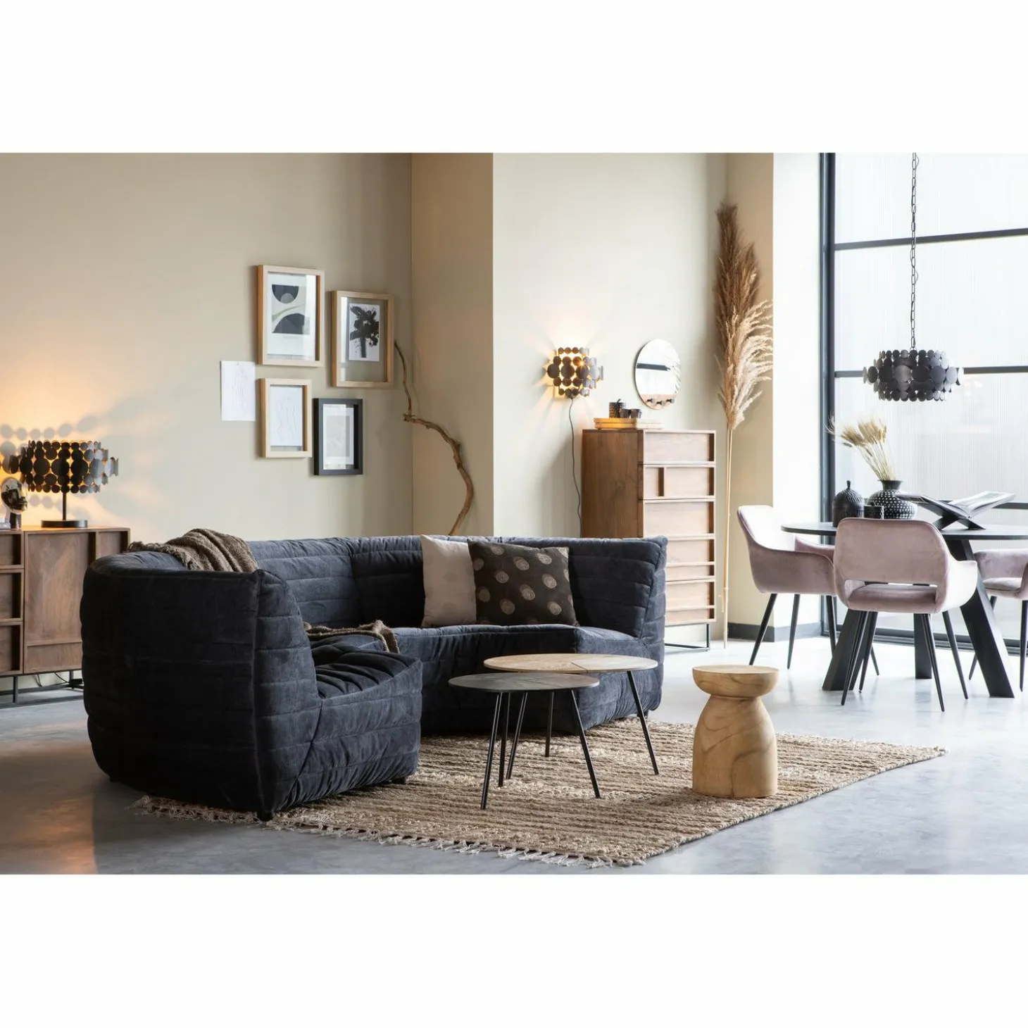 Of je nu een moderne, landelijke of industriële woonstijl hebt, de Rhonda eettafel past zich moeiteloos aan. Stel je voor: een sfeervol diner met vrienden, de tafel gedekt met je mooiste servies, en de warme gloed van kaarslicht dat weerkaatst op het zwarte tafelblad.