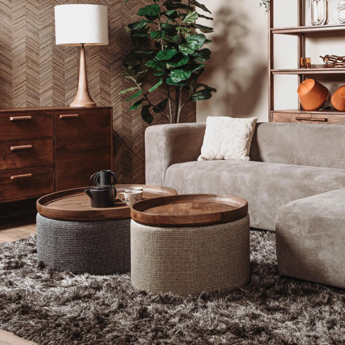 Combineer er eindeloos op los met de poefjes en tafeltjes van de collectie Ossana. Er is namelijk voor elk wat wils. De collectie bestaat uit zwarte fijn geborstelde mango houten tafeltjes, salontafels gestoffeerd met prachtige luxe en exclusieve stoffen en hockers met luxe hotel chique uitstraling. Bij de salontafels zijn de dienbladen afneembaar