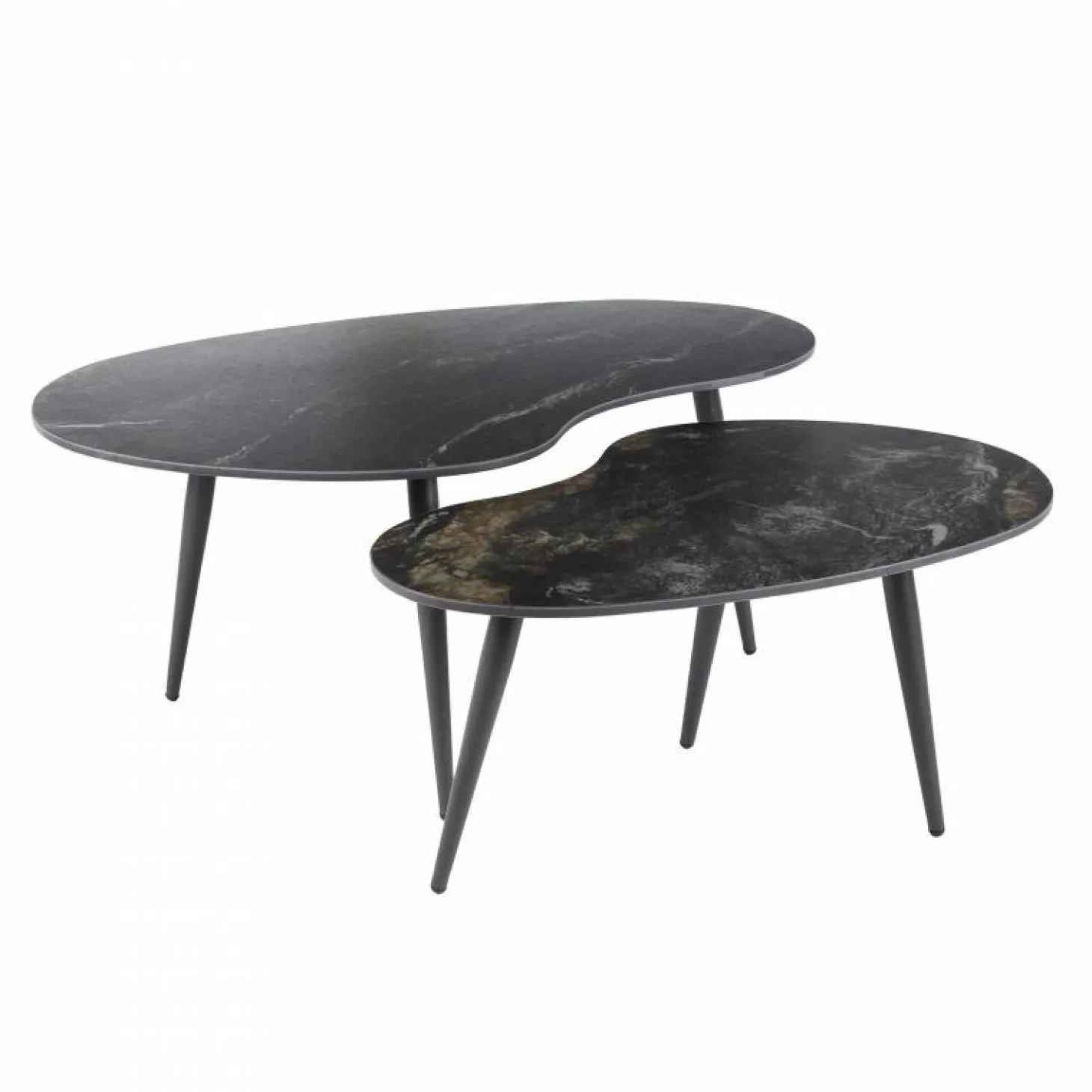 Deze elegante niervormige salontafel set van 2 combineren een minimalistisch frame met een luxe ceramic blad waardoor ze een verfijnde uitstraling hebben. Perfect voor zowel moderne als klassieke interieurs. Deze tafels zijn veelzijdig en functioneel.