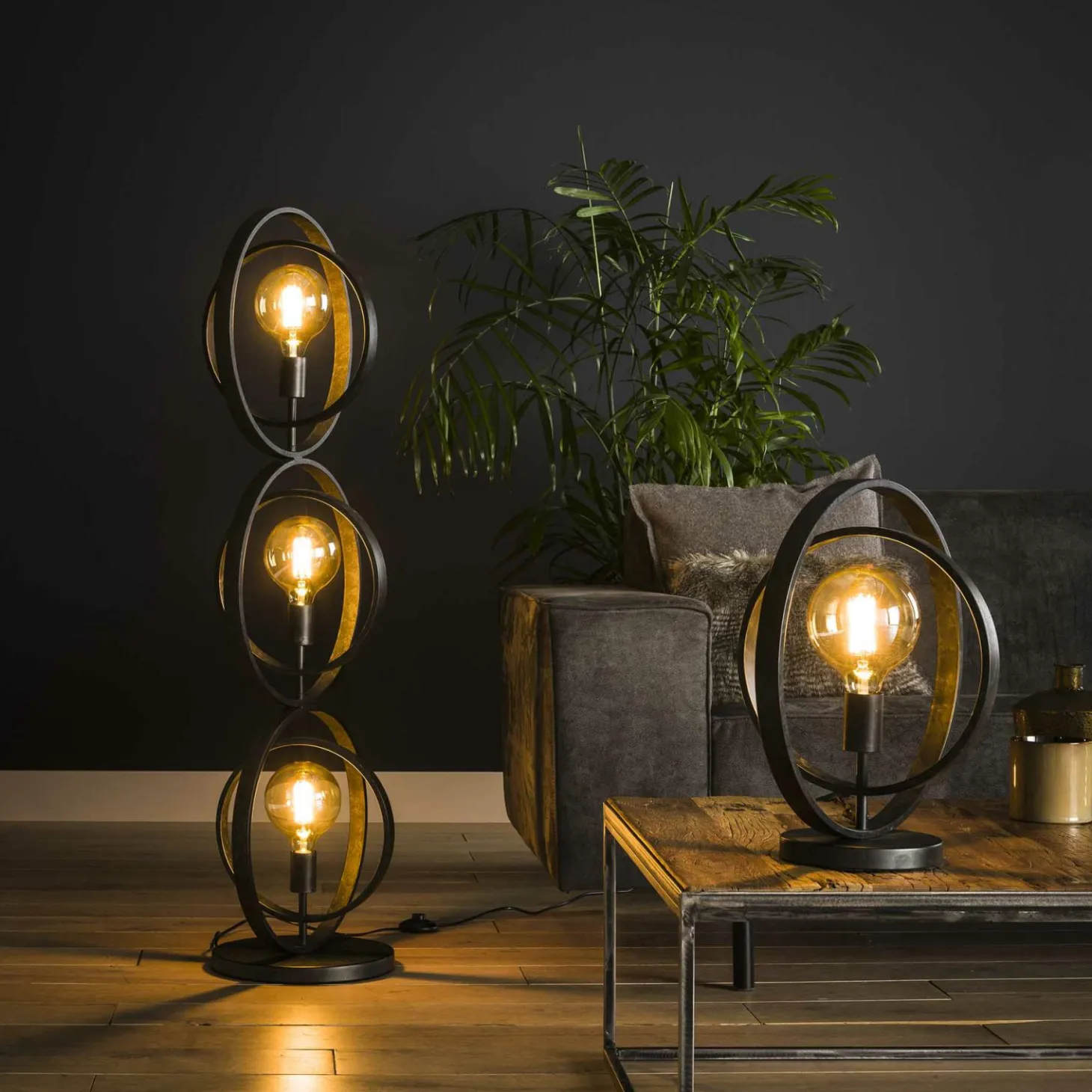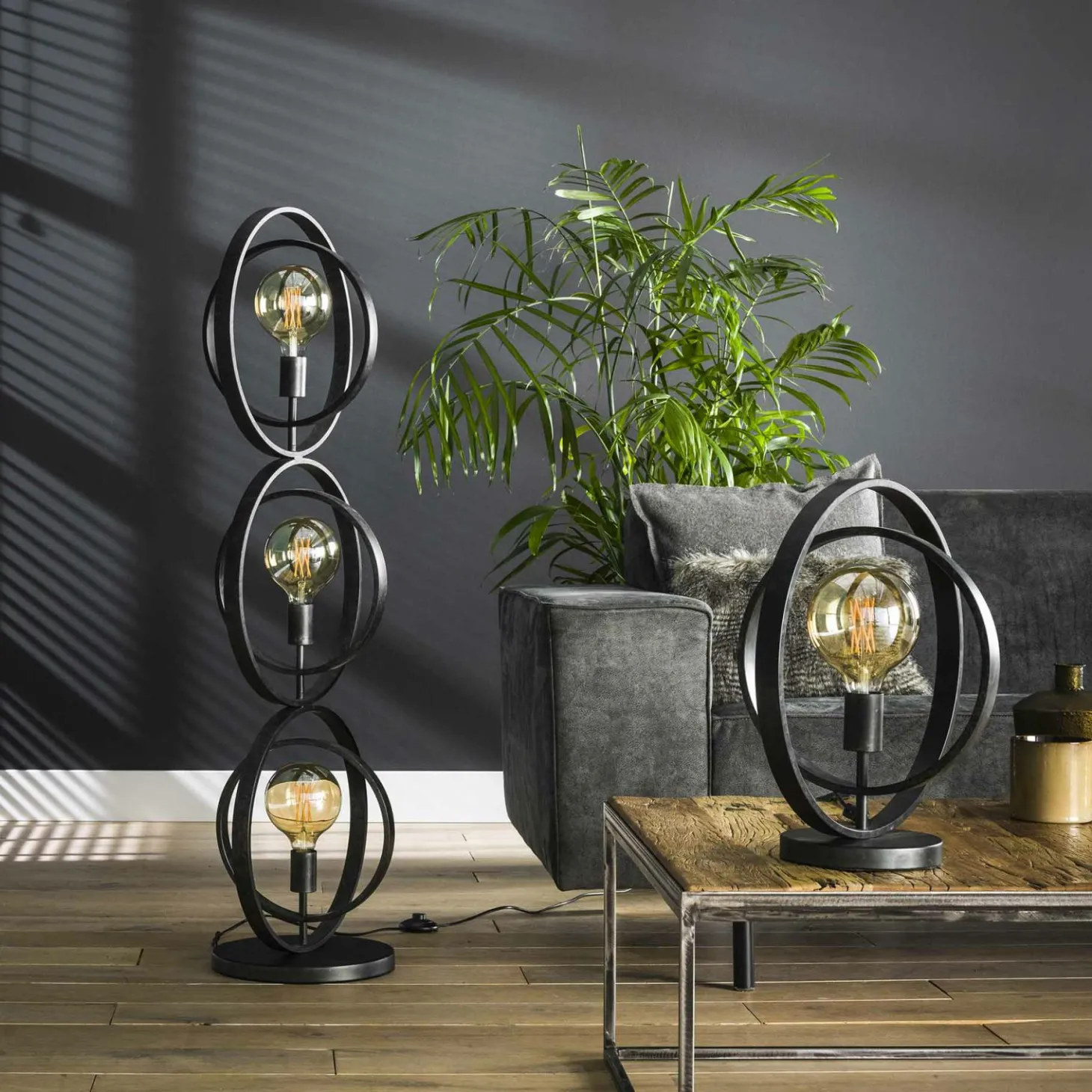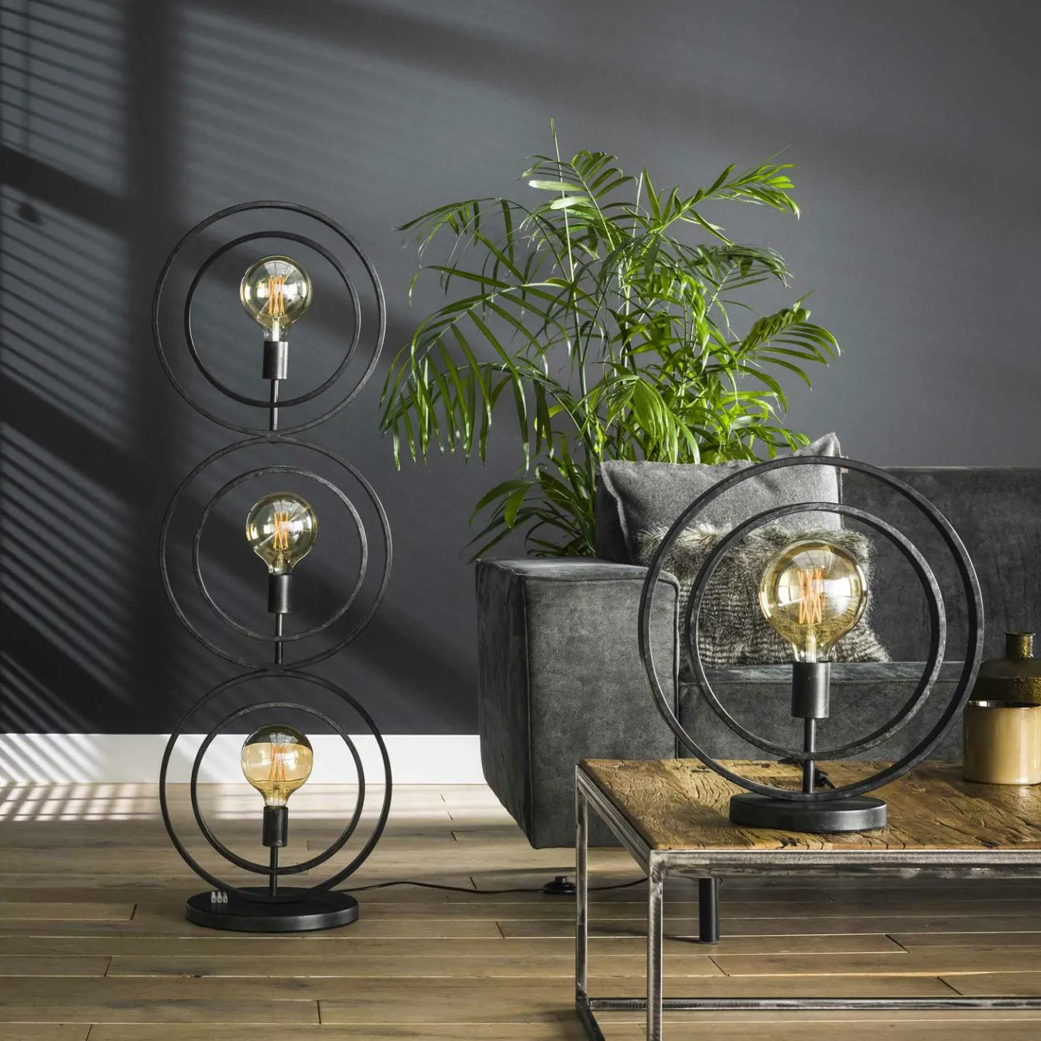 Deze tafellamp ‘Turn around’ is gemaakt van metaal met een Charcoal finish. De buitenste cirkel zit vast op de voet en de binnenste cirkel kan volledig rond draaien, waardoor deze op de gewenste manier geplaatst kan worden. Door het opengewerkte armatuur komt de lichtbron volledig tot haar recht. Deze tafellamp maakt deel uit van serie bestaande uit twee hanglampen, een vloerlamp en een tafellamp. Er wordt aanbevolen LED lichtbron (8467) te gebruiken.