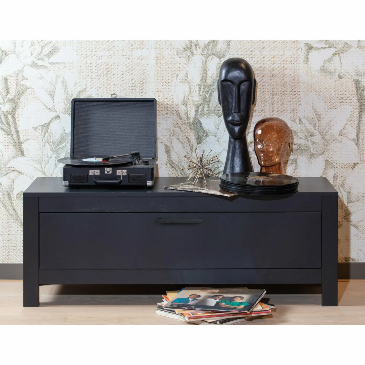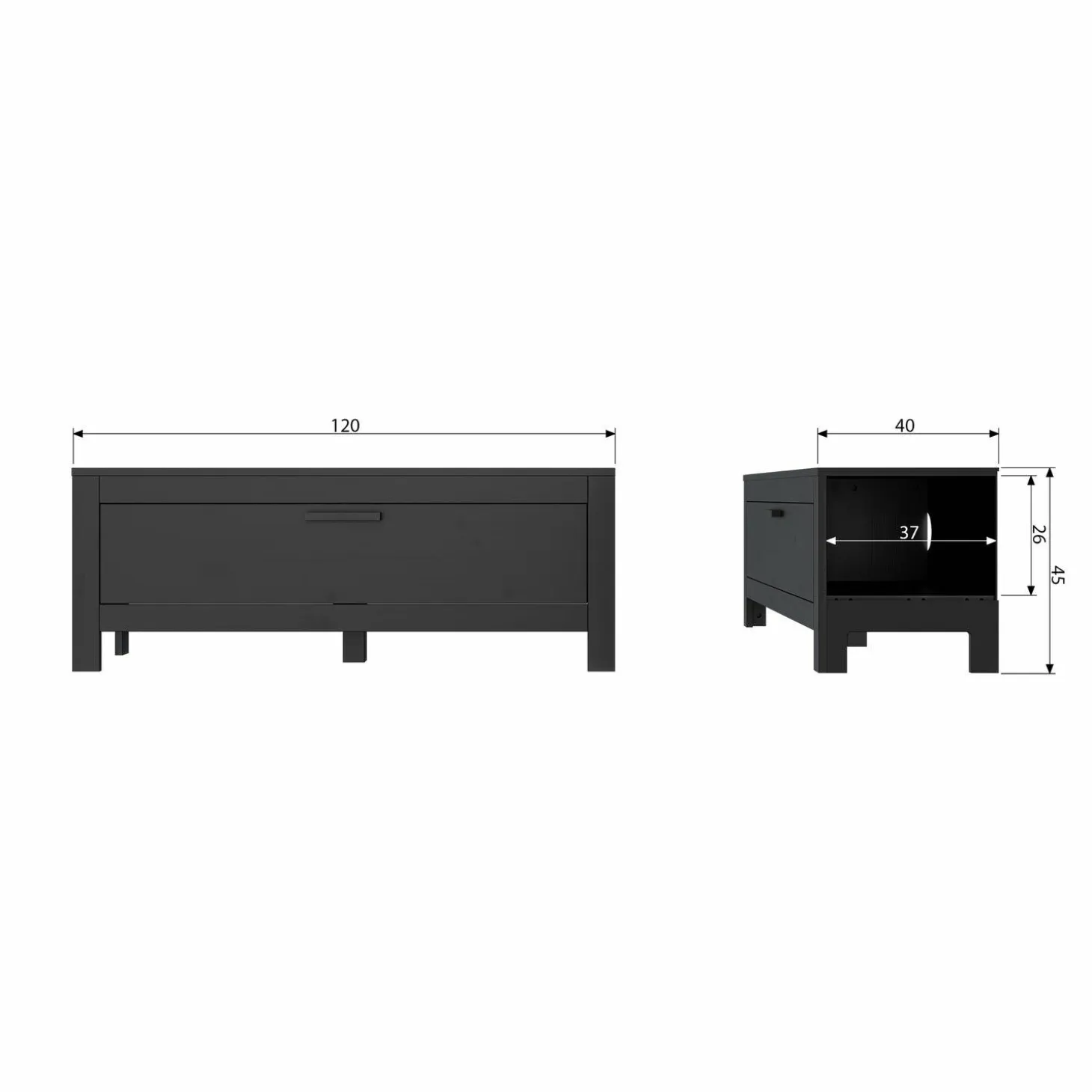 Met zijn compacte breedte van 120 cm en een hoogte van 45 cm, past Bonk moeiteloos in elke woonkamer, groot of klein. Achter de brede kastdeur vind je een zee aan opbergruimte voor al je apparatuur en andere spullen die je liever uit het zicht houdt. Het zwarte schuifslot zorgt voor een gebruiksvriendelijke ervaring, terwijl de vijf stevige poten stabiliteit garanderen.