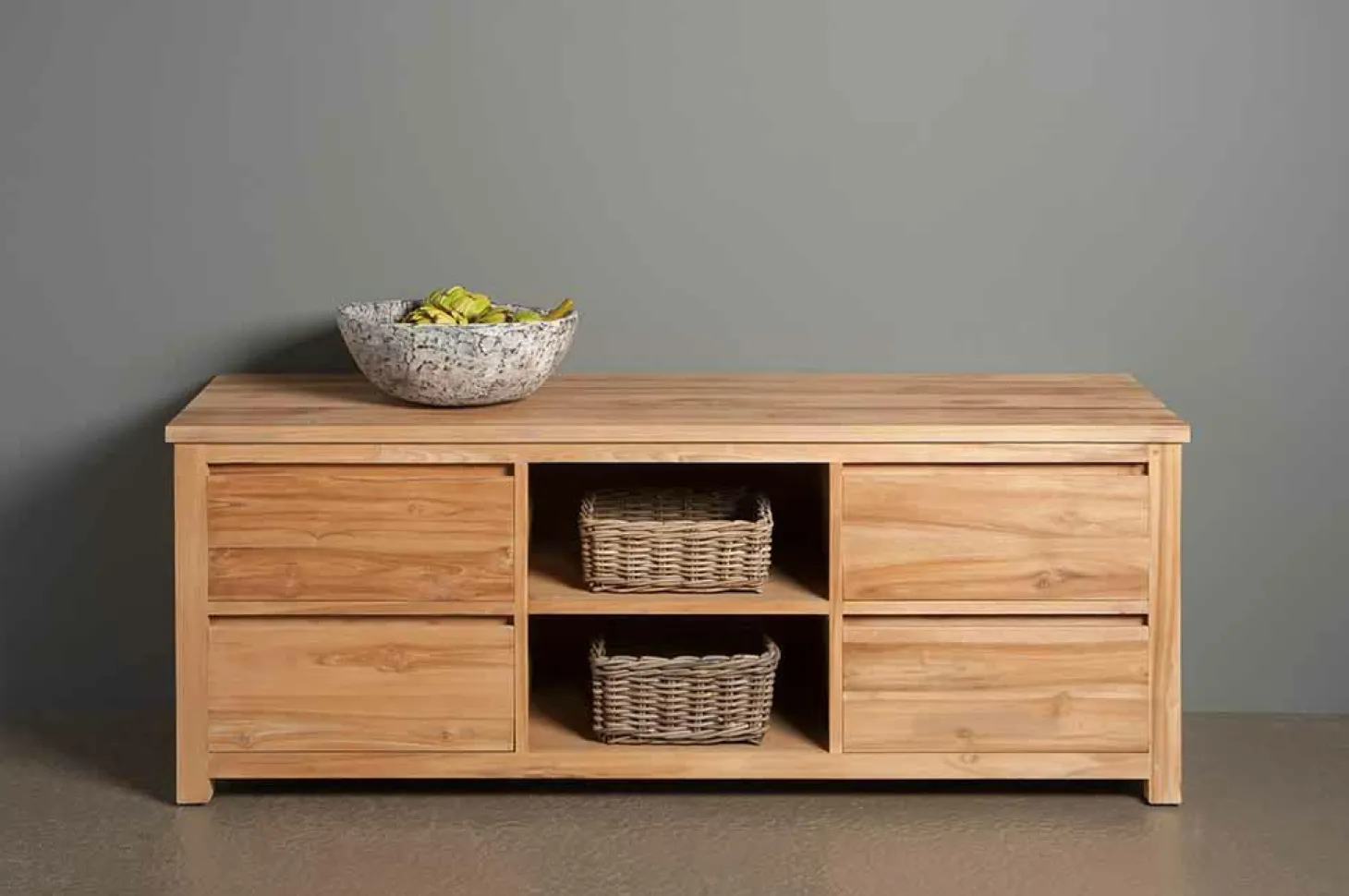 Opbergkast Felinio is gemaakt van Teakhout, gecombineerd met staal.