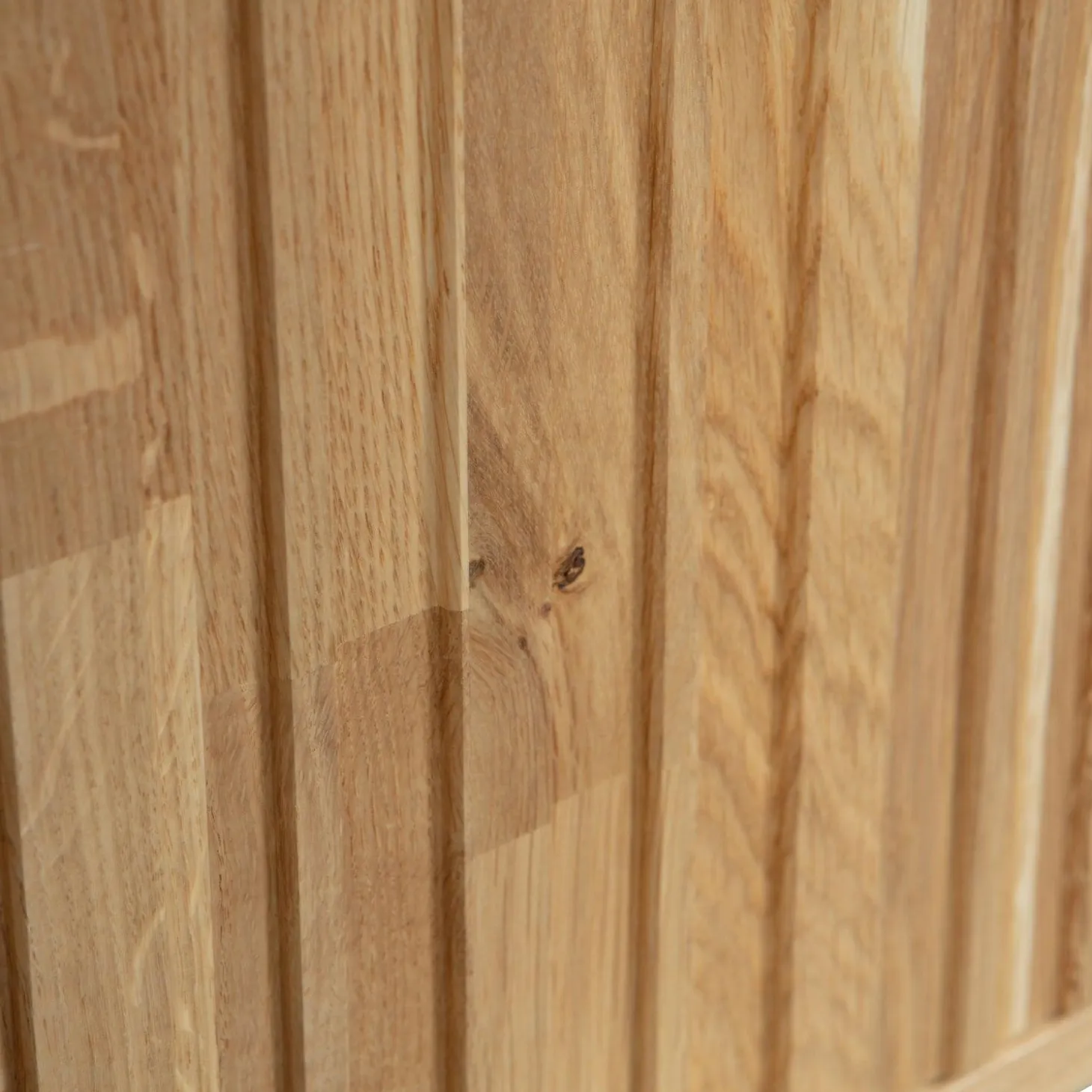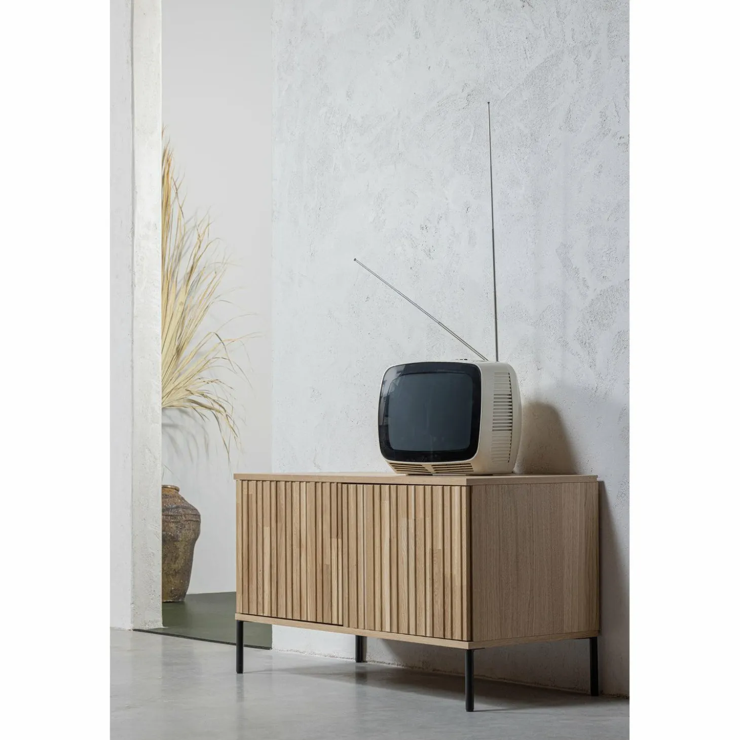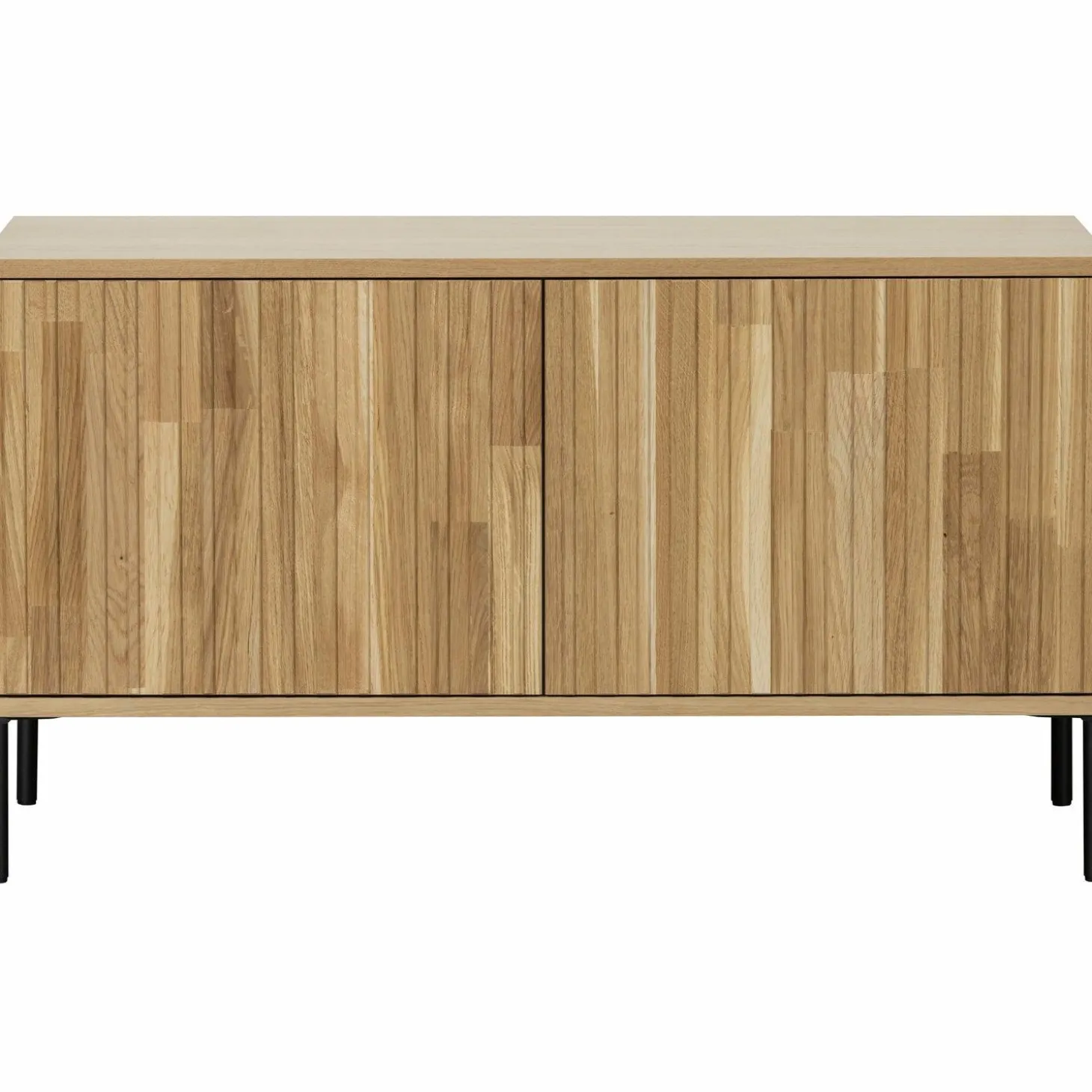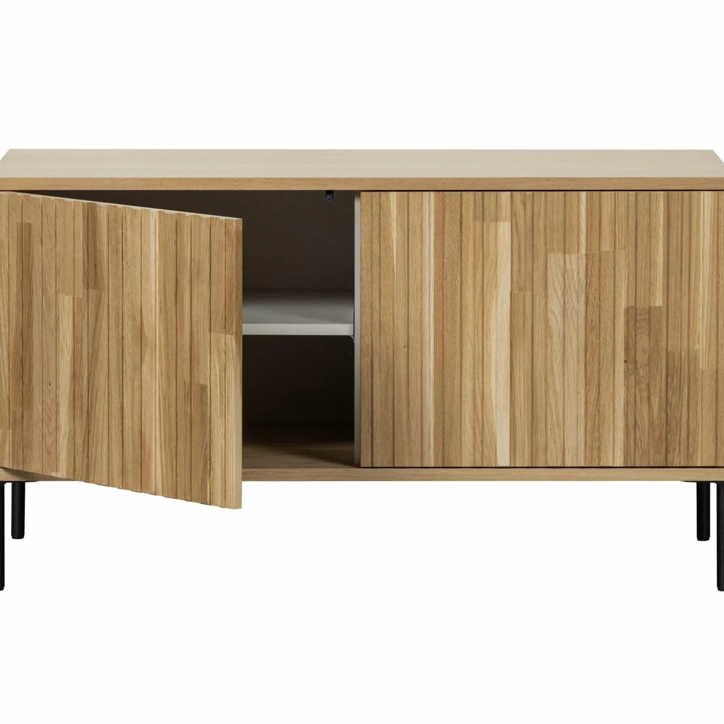 Met zijn natuurlijke eikenhout fineer en subtiele blanke lak straalt dit meubel een warme, uitnodigende sfeer uit. De grafische reliëfdeuren voegen een speelse twist toe, terwijl het zwarte metalen onderstel zorgt voor een stoere touch. Dankzij het geluidloze push-to-open systeem geniet je van een strakke, minimalistische uitstraling zonder zichtbare handgrepen.