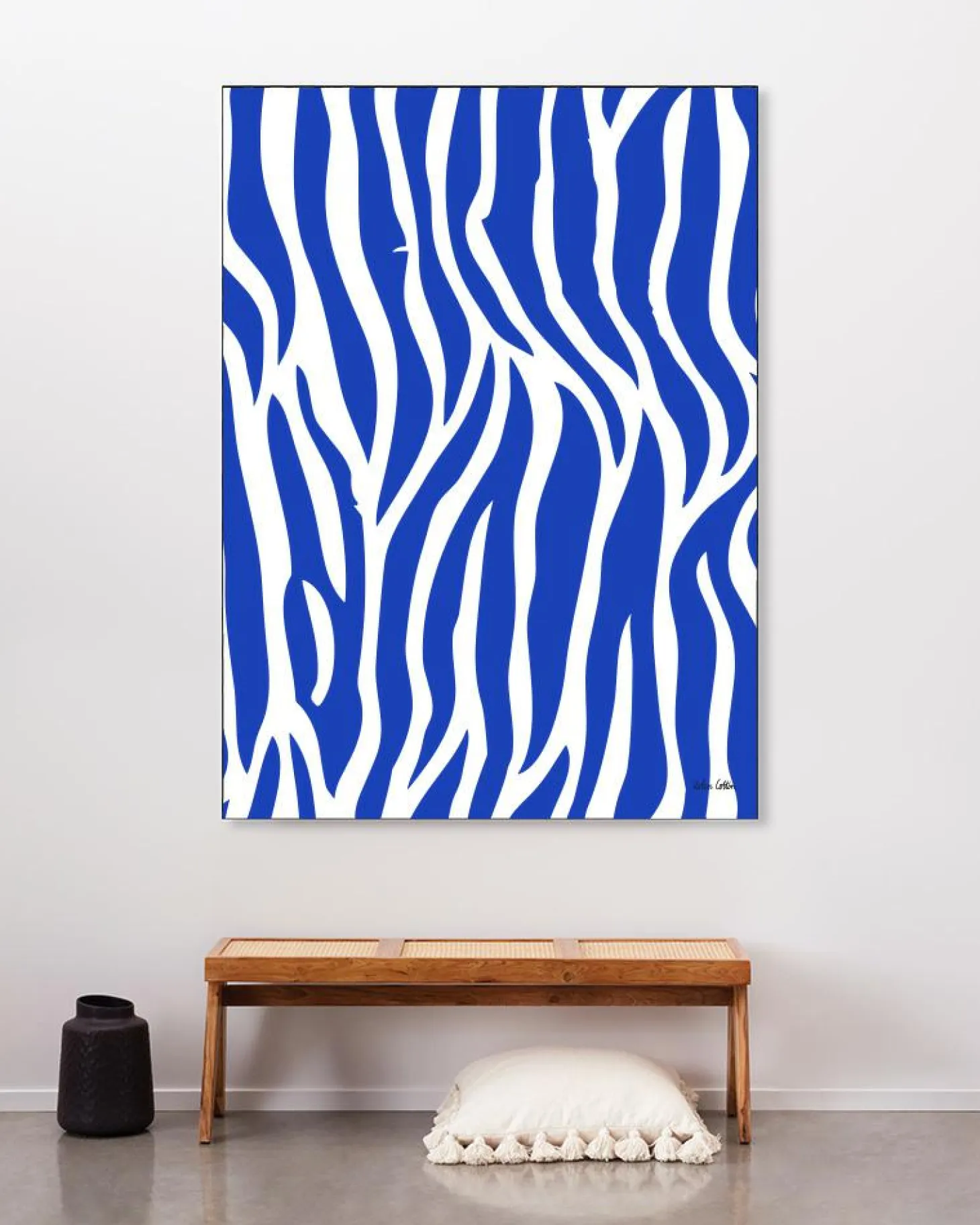 Met het zwarte aluminium frame passend bij de maat van het wandkleed span je het wandkleed strak in de frame. Het frame hangt hiermee strak aan de wand.
