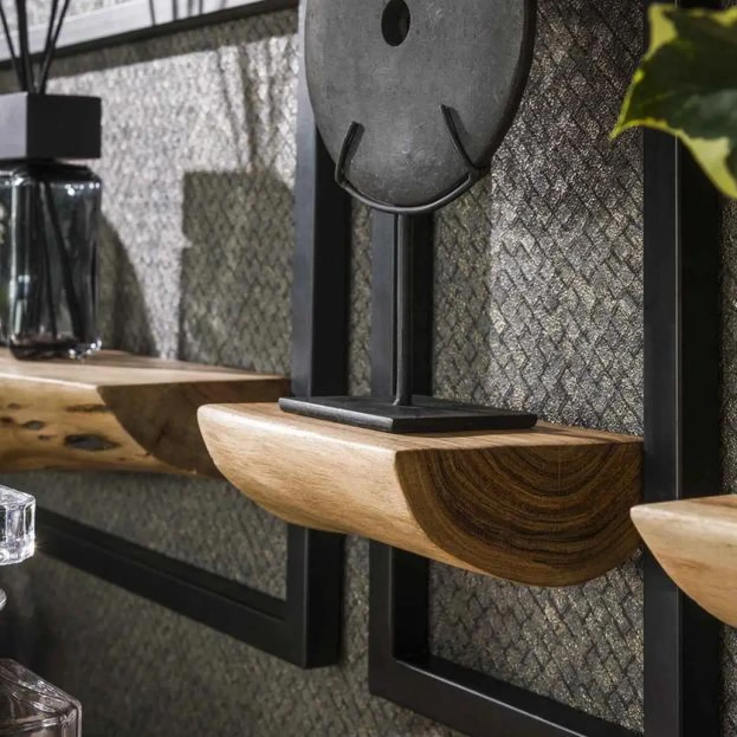 Deze trendy wandschap set ‘edge’ is uitgevoerd in massief naturel acacia hout en gepoedercoat metaal. De schapjes hebben een live edge afwerking. De schapjes komen als set van 5 en worden allen door middel van 2 oogjes aan de muur gemonteerd. De set kan naar eigen inzicht aan de muur worden gemonteerd. De schappen kunnen namelijk op meerdere manieren een passende rechthoek vormen.