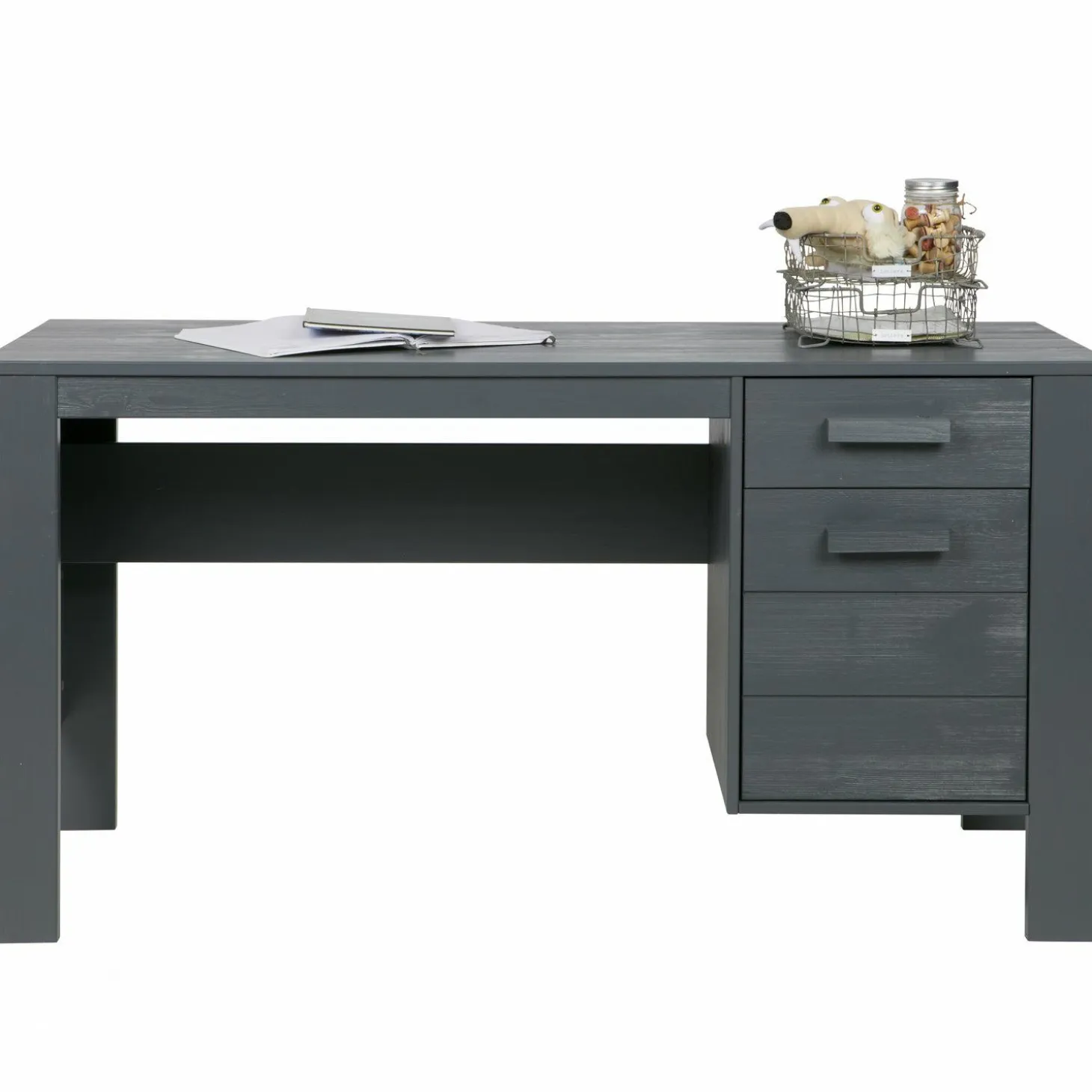 Ontsnap aan de dagelijkse hectiek en creëer jouw eigen oase van rust met Bureau Dennis in de stijlvolle kleur Steel Grey. Dit stoere bureau van WOOOD is niet zomaar een werkplek; het is een statement in jouw interieur. Gemaakt van geborsteld grenenhout, straalt het een robuuste charme uit die elke ruimte een unieke uitstraling geeft.