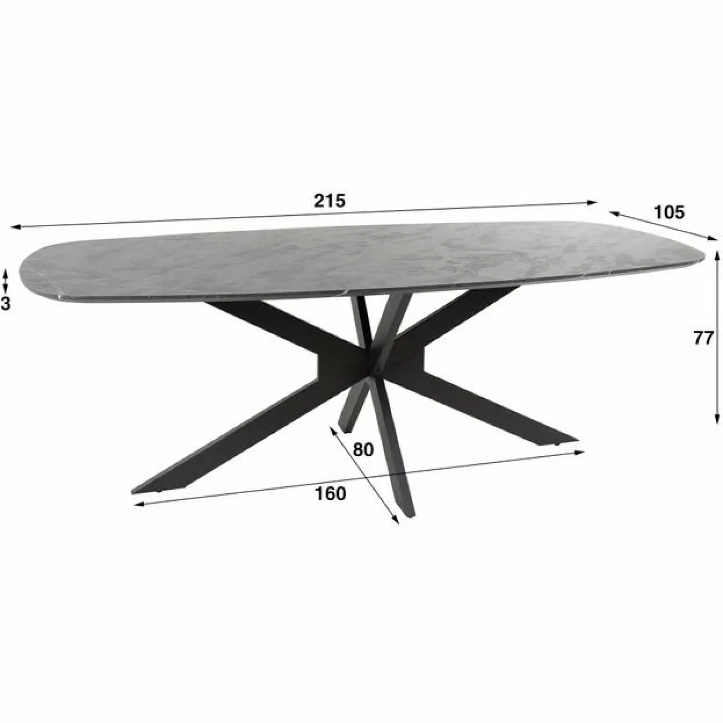 Deze eetkamertafel is uitgevoerd in melamine met een ceramic uitstraling en een spider frame in staal. De tafel is haast niet te onderscheiden van een ceramic tafel. Het handgemaakte tafelblad is voorzien van een laagje melaminehars dat is aangebracht op hout. Het materiaal wordt door hitte en druk aangebracht. Het prachtige materiaal in combinatie met de deens ovale vorm, geeft een trendy, maar tegelijk ook tijdloze tafel. Deze tafel is verkrijgbaar in drie maten, namelijk 150 cm, 180 cm en 215 cm.