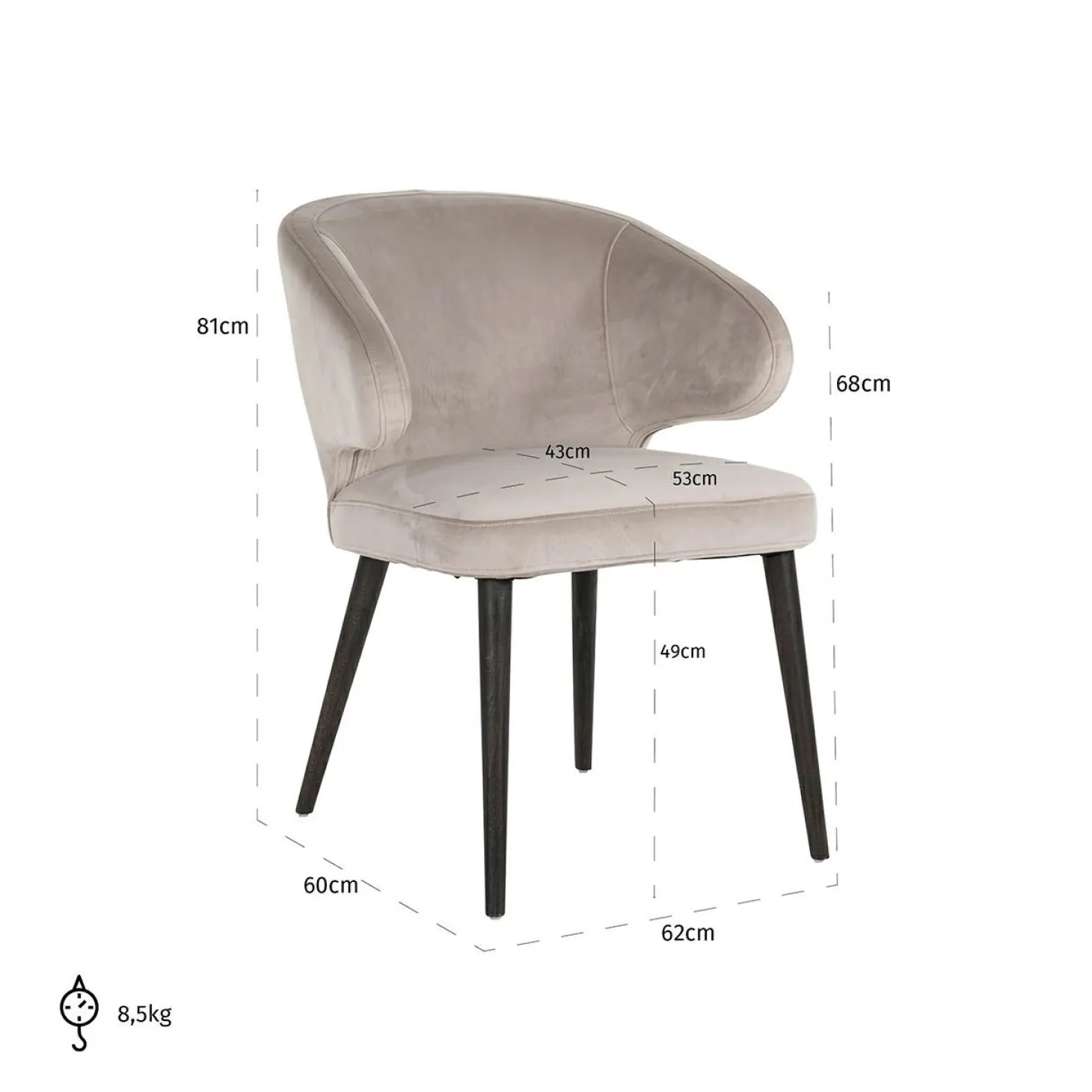 | Materiaal | zitting bekleed met luxe Velvet 100% Polyester, Zwart gelakt beukenhouten poten |