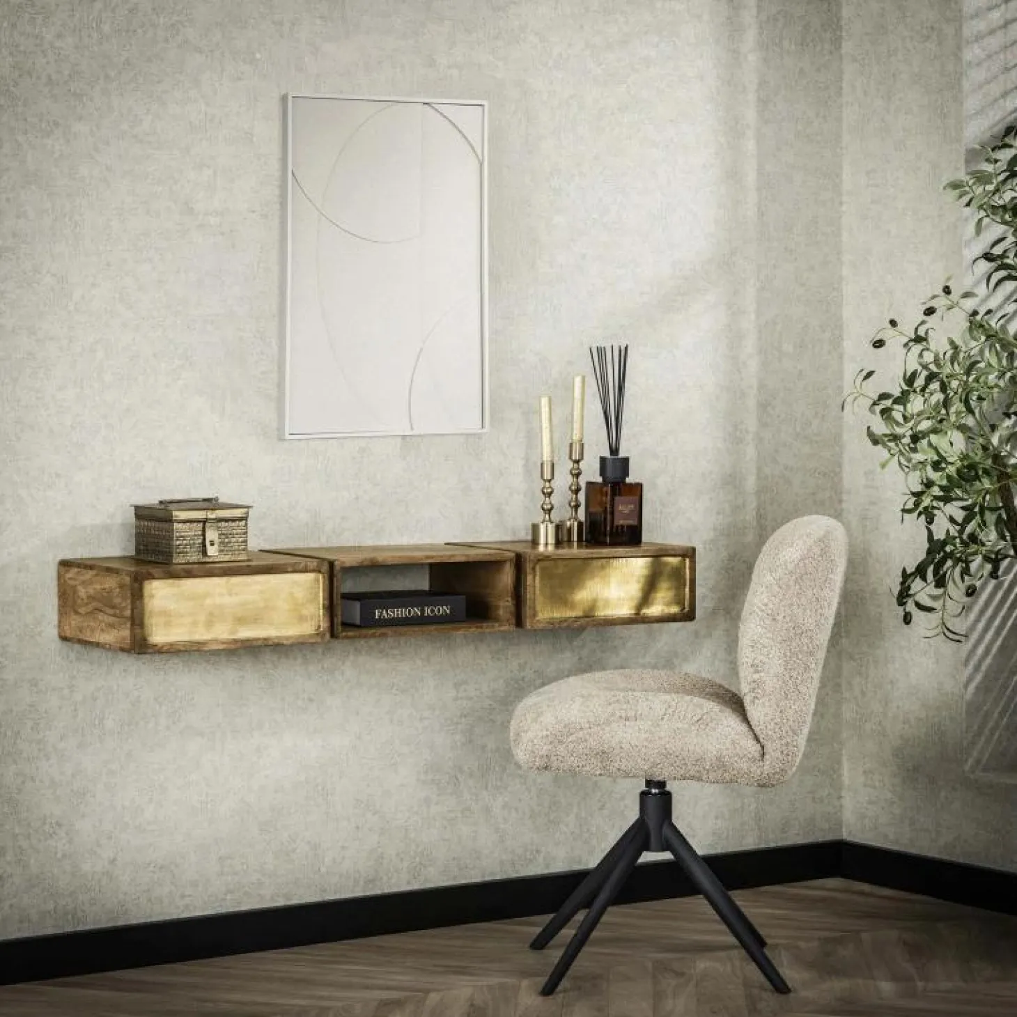 Deze kaptafel ‘brass’ is gemaakt van massief duurzaam mango hout en heeft een echt messing beslag. Dit wordt door middel van cladding gecreëerd. Het messing is licht geantiqueerd. De kaptafel beschikt over één open vak en twee lades. De kaptafel wordt door middel van strips, welke in de muur worden geboord, gemonteerd.