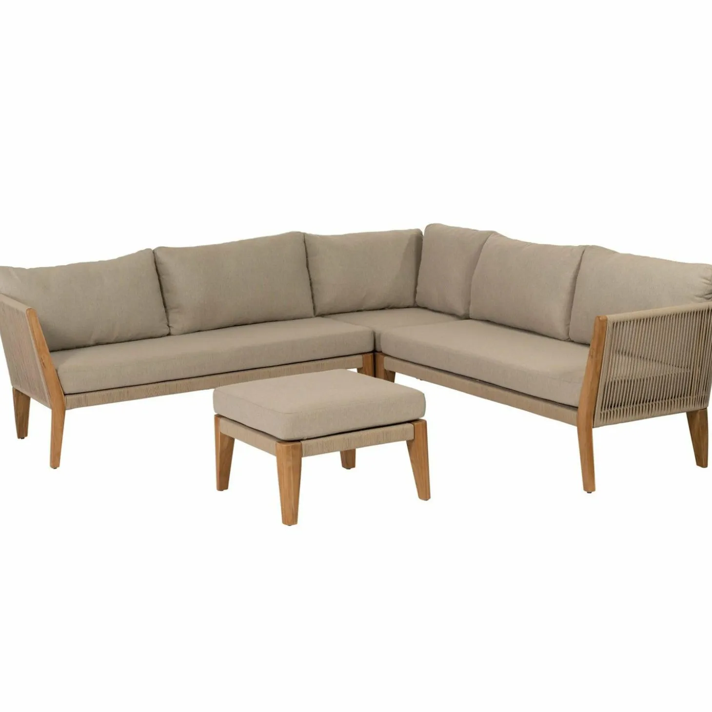 Met een robuust frame van aluminium, afgewerkt met trendy rope en duurzaam teak, biedt deze set een perfecte mix van modern design en natuurlijke charme. De zandkleurige kussens, gemaakt van sterke olefin stof, nodigen uit om heerlijk weg te zakken. Let wel, na een dag vol ontspanning is het slim om de kussens binnen op te bergen om ze in topconditie te houden.