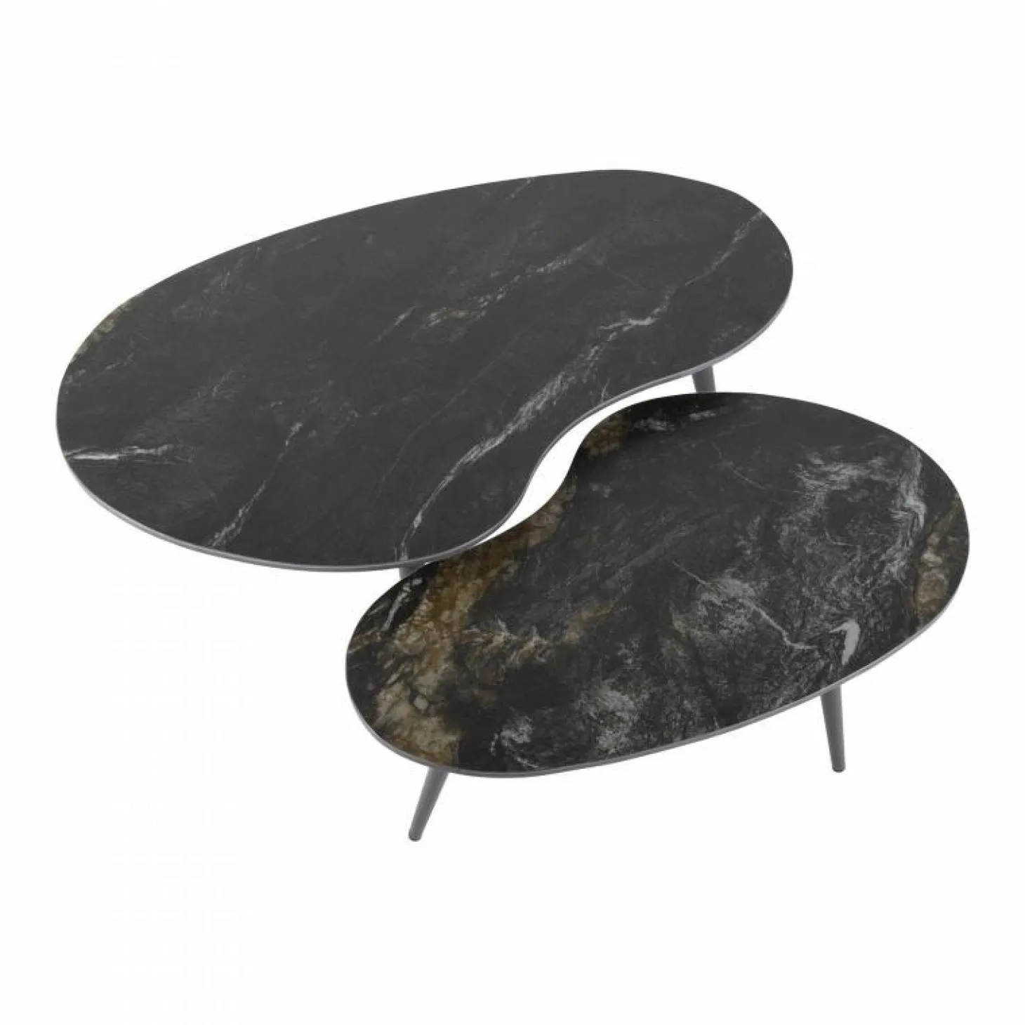 Deze elegante niervormige salontafel set van 2 combineren een minimalistisch frame met een luxe ceramic blad waardoor ze een verfijnde uitstraling hebben. Perfect voor zowel moderne als klassieke interieurs. Deze tafels zijn veelzijdig en functioneel.