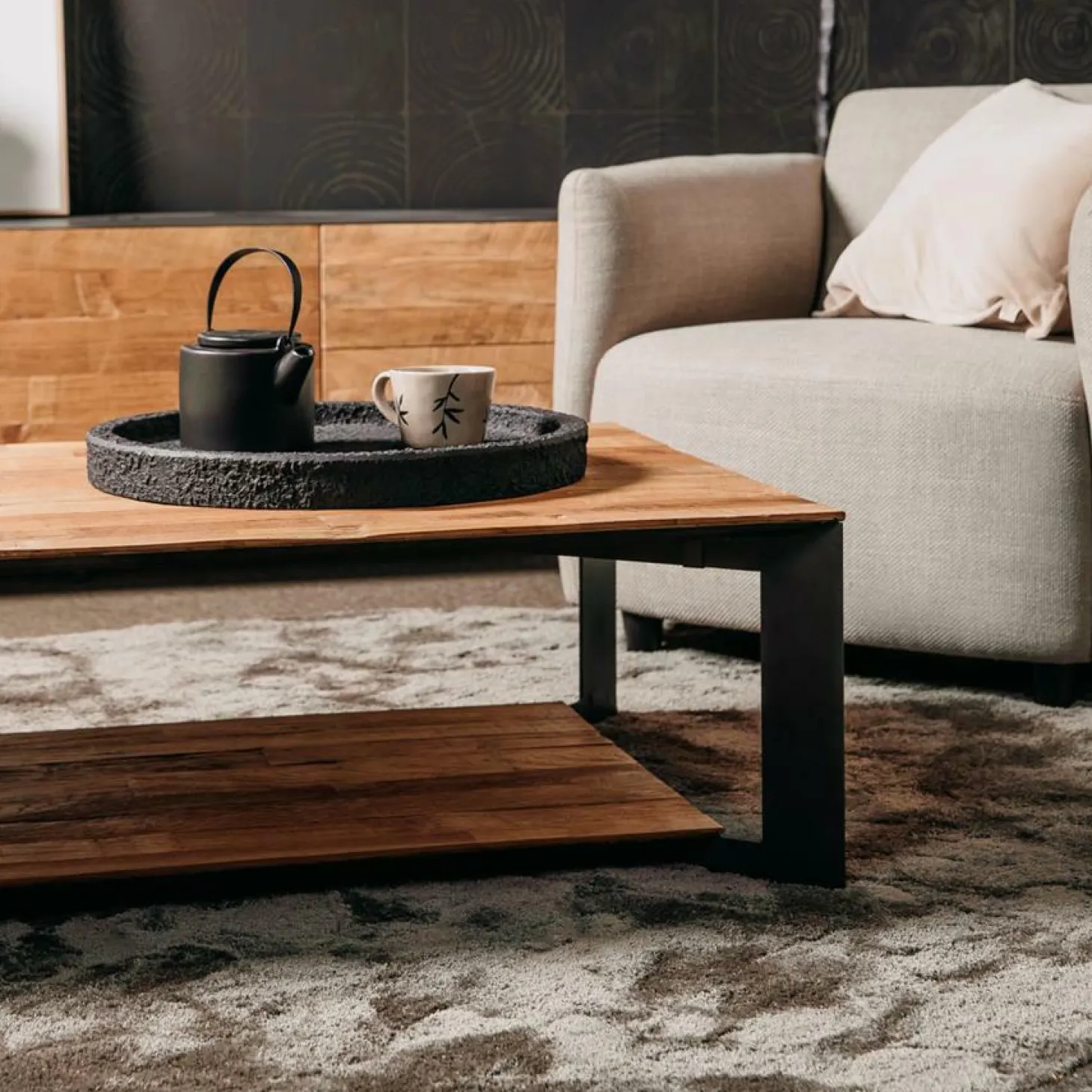 | Materiaal | Donkerkleurig metalen frame met blad gerecycled Teakhout |